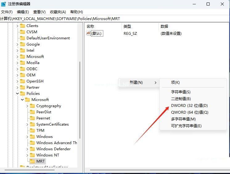 2、接着,在打开的界面中,依次点击展开“HKEY_LOCAL_MACHINE\SOFTWARE\Policies\Microsoft”,并右键选择新建一个名为“MRT”的项,如图所示: