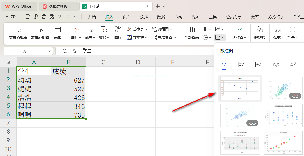 2.这时即可在工具栏中找到自己喜欢的散点图样式,将其点击插入。
